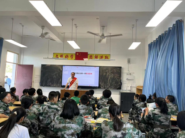 教室里,學生們一個個身穿迷彩服,聚精會神地聆聽著,普法志愿者先后向學生們宣講了《中華人民共和國國防教育法》《中華人民共和國國家安全法》《中華人民共和國未成年人保護法》《中華人民共和國憲法》以及消防安全、交通安全、防詐騙等常識。課后,學生們在教官的帶領下,開展了體能訓練。