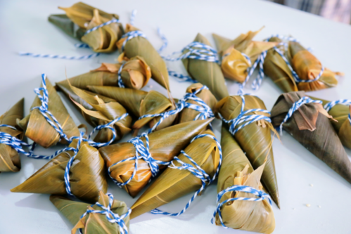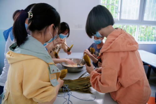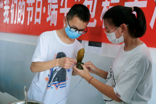 為了包粽子比賽能順利進行,學(xué)生們提前一天清洗好了粽葉,學(xué)校食堂也提前準(zhǔn)備好了糯米、,蜜棗、紅豆、細(xì)繩等包粽子材料。活動中,學(xué)生們分成各個小組,有條不紊的按步驟先將棕葉卷成小漏斗狀,用糯米填充壓緊,再加入餡料,最后用繩索打結(jié),食堂里充滿了學(xué)生們的歡聲笑語。從沒有包過粽子的學(xué)生們在老師的指導(dǎo)下也逐漸掌握了包粽子的竅門,并在學(xué)習(xí)的過程中感受到了其中蘊含的悠久文化歷史與傳統(tǒng)。經(jīng)過近兩個小時的辛勤勞作,形狀各異的粽子在學(xué)生的手中誕生,現(xiàn)場歡聲笑語,其樂融融。