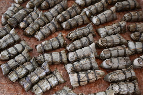 徽州枕頭粽綁扎不用棉線,用的是撕成條的棕樹葉,這也形成了徽州粽子獨有的風格。包粽子絕對是個技術活,只見戴小音拎出兩片箬葉錯落搭好,兩手輕輕一彎,彎出小小的圓錐形狀,一撮糯米添在尖尖的角里,夾塊肉放在米中,再把一撮米蓋在上面,然后手緊緊捏著盛滿餡的箬葉,一根棕樹條緊緊繞過系住打結,捆綁三道,一個精巧的四角粽子便做好了?!鞍兆雨P鍵是要把米粒壓緊、捆綁結實,不漏角,否則煮熟后會松松垮垮的,水進去了就不好吃了。”