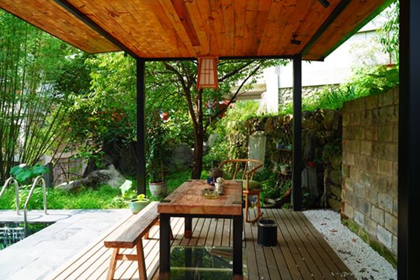 書吧內,沙發、桌椅布置得格外親切,環境雅致寧靜,在這里看看書、喝喝咖啡,下午茶在這呆一呆,都是不錯的選擇。沙發上方精心制作了照片墻,記錄下游客們在此最好的瞬間和最美的回憶。室外花園內還為小朋友們設計了游泳池和魚池,引入清冽的山泉水,古色古香中不失天然野趣,與周邊的大山、竹林等自然景色融為一體,有幽幽花香,啾啾鳥鳴相伴。陽光透過竹葉照射下來,風兒吹過,纖細伸展的枝葉隨之輕舞,沙沙的竹葉悄聲密語。