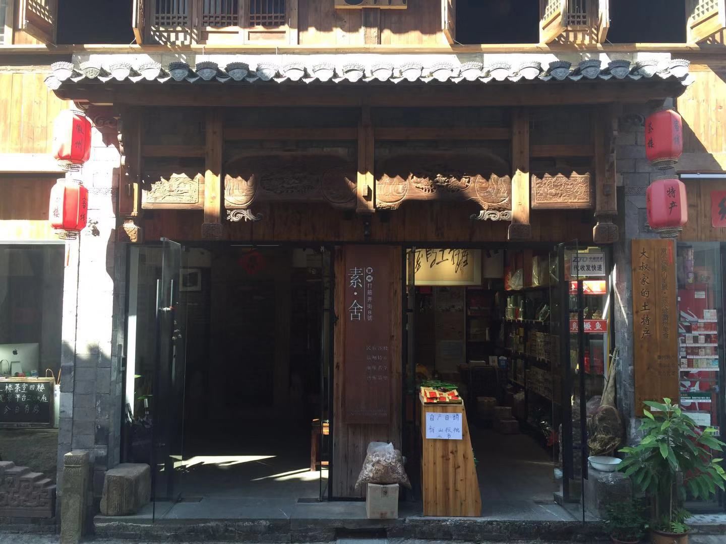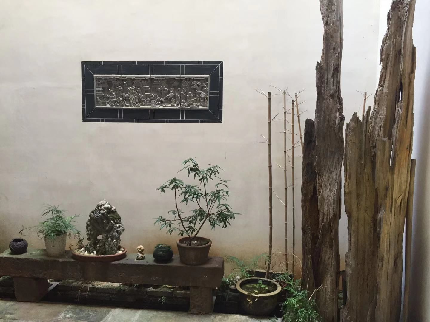 在素舍,處處透著“文藝范兒”,濃濃的徽州文化元素被精心的安置在客棧的角角落落。大堂一隅,方見塵等徽州大師的歙硯、書畫作品,給古色古香的客棧增添了濃郁的藝術氛圍。二樓改造過的大天井,將燦爛陽光與新鮮空氣,送進每一間房內,一掃老宅客棧的逼仄與壓抑。據客棧主人介紹,庭院里的奇趣景觀,是從山野里撿回來的兩段朽木;樓梯間墻上的光緒年間磚雕,是多年前從老宅廢墟找出來的;古樸雅致的清代雕花條幾,是畫家的日常興趣收藏……客棧內像這樣“化腐朽為神奇的藝術”比比皆是。