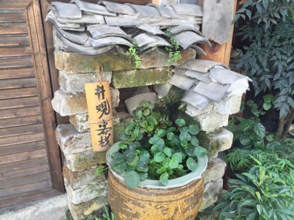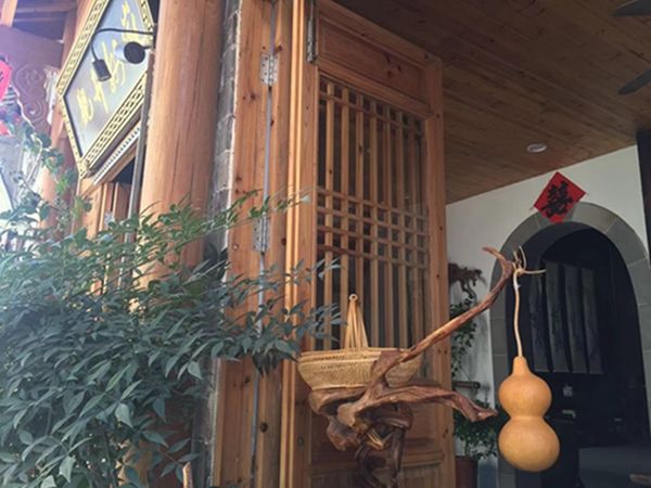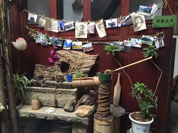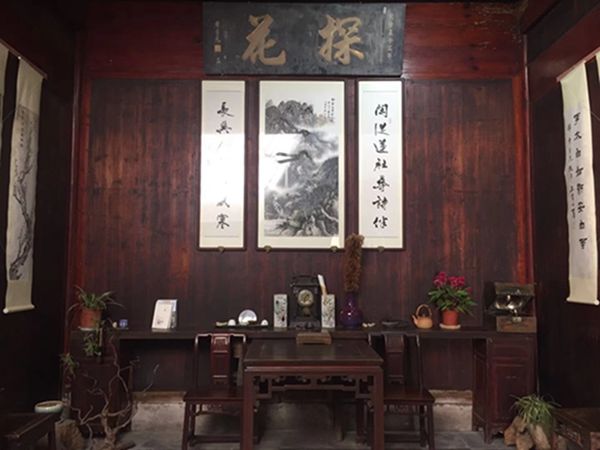 推開徽州井觀客棧的小木門,映入眼簾的是前廳一棵造型別致的干樹枝,上面錯落擺放的松果,仿佛正張開雙手迎接住客,角落里一段枯木制成了盆景架、鏤空雕花的木窗像幅畫掛在墻上,常春藤爬滿了小小的石磨盤,也讓小小的前廳多了些生機。踏過階梯,穿過石拱門,就進入了客棧的大廳,前半部照例是四水歸堂的天井,后半部則是整潔明亮的廳堂,廳上按例設有徽式條案、八仙桌椅,條案上擺放鐘、瓷瓶和鏡子,取“終生平靜”之意。門廳上方的“探花”匾額,道出了老宅的前身,據李梅介紹,這個老宅原是清朝乾隆年間的探花府邸,房子雖然不大,但造型布置卻處處考究。“一些客人聽說我們是探花舊宅,特意帶孩子來,沾點文氣。”李梅說,或許是因為出過探花的緣故,客棧被很多人視為福宅,很多游客會慕名而來。